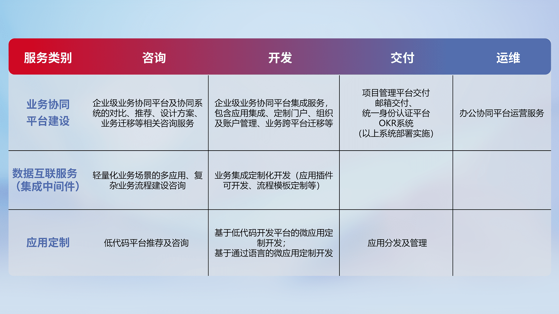 针对钉钉、、企微、、、、IDaas等平台级产品提供产品的规划、、、、方案、、、交付、、定制化开发等服务,,,实现如统一协同办公、、、、智能客户服务、、混合会议管理、、智能数据查询、、等业务场景,,,,实现数字化转型。。。。
